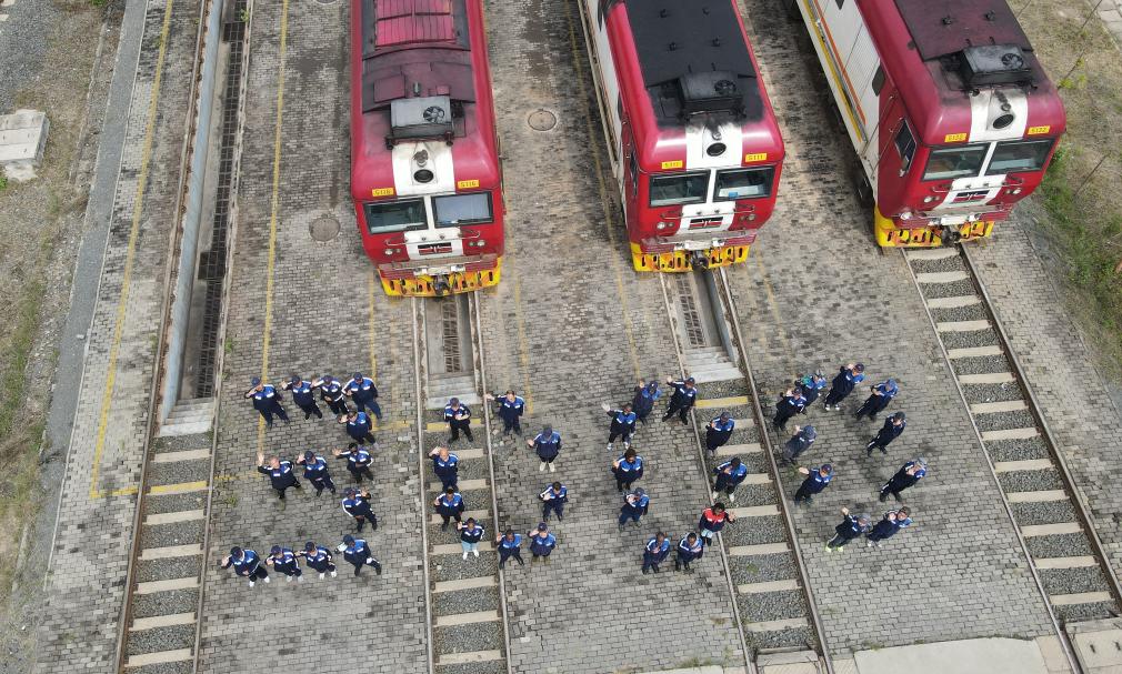 8月19日,在肯尼亚内罗毕非洲之星铁路运营有限责任公司机务运转整备场,中肯两国铁路工作者在机车前站列并组成“3000”字样,以纪念蒙内铁路实现安全运营3000天(无人机照片)。新华社记者 杨光 摄